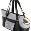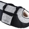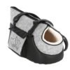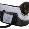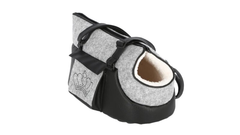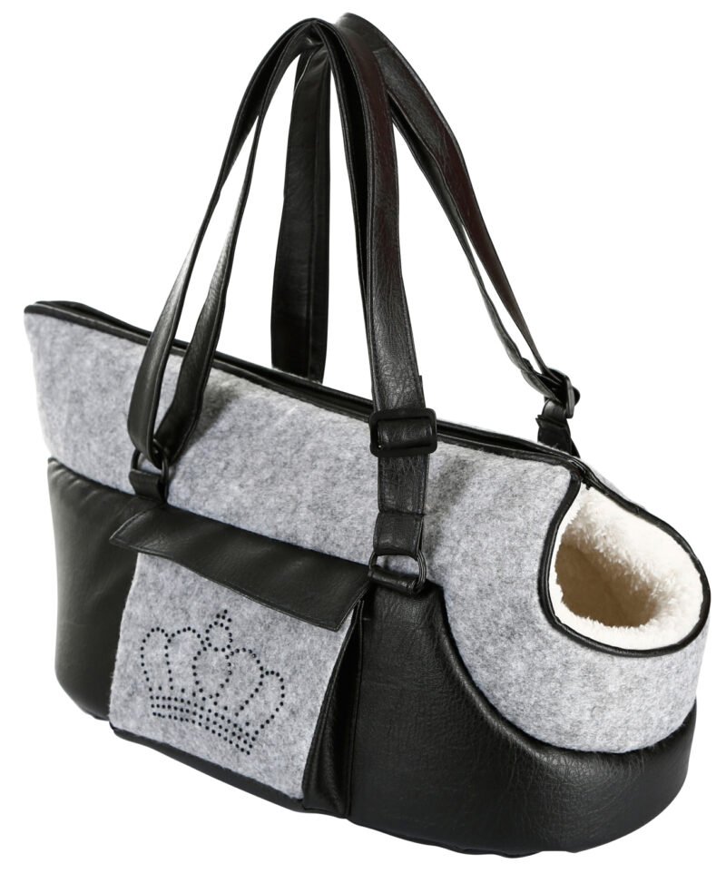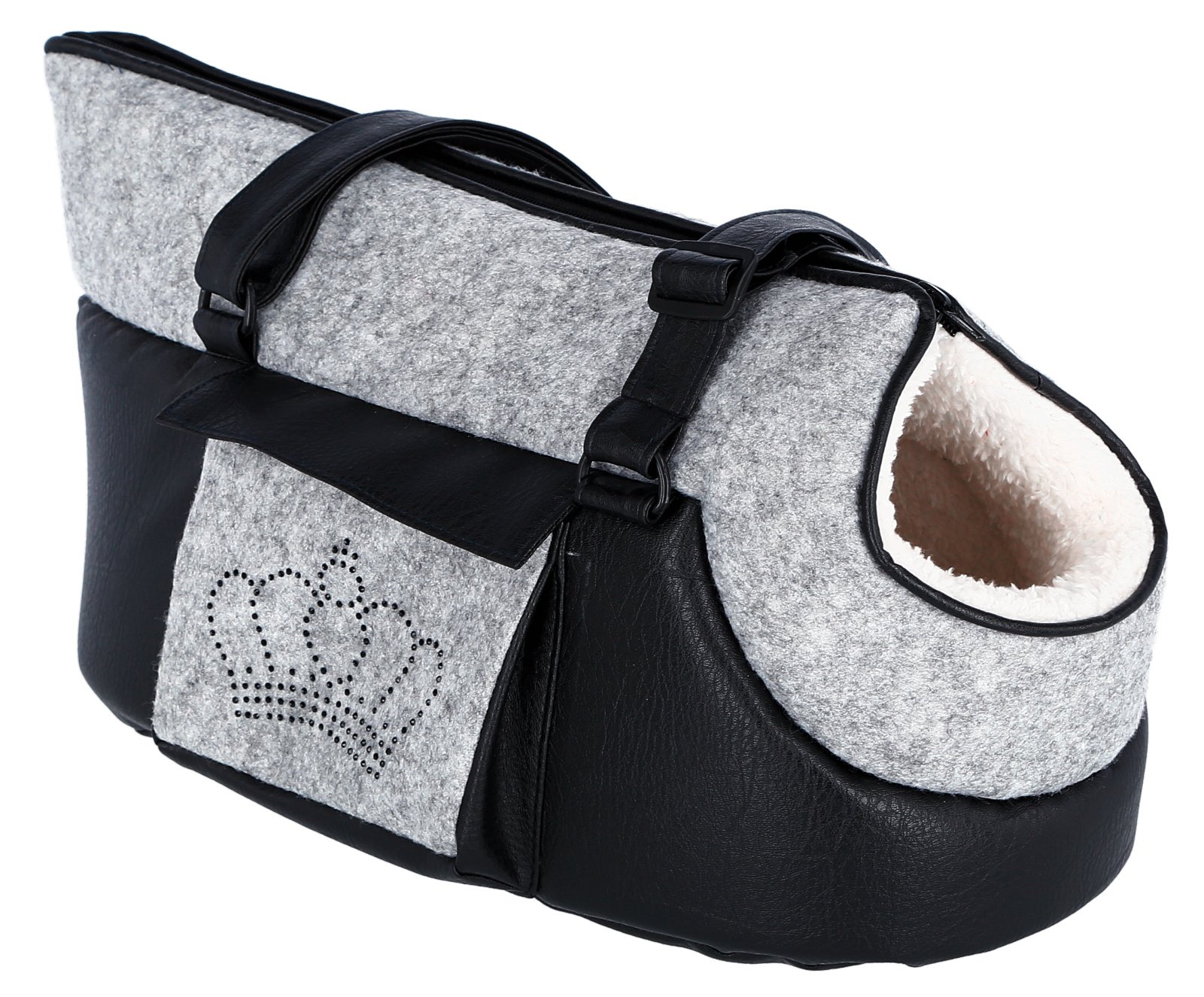Comfortable and soft: The comfortable travel bag is equipped with a soft, cuddly inner lining so that your four-legged darling can enjoy especially pleasant transport., Stylish and robust: The high-quality cover made of felt and faux leather, with rhinestone appliqué, is both robust and fashionable, and so you are always stylish when out and about with your animal., Safe and practical: The zip fastener and an integrated short lead ensure safe transport and prevent the animal from jumping out. The carrying strap is adjustable, and the inner cushion can be washed at 30 °C., Everything is there: The travel bag for dogs and cats has an additional, practical side pocket for carrying treats, accessories, or other items., Flexible in use: Whether for a stylish trip to the vet or for distances too long for your four-legged friend – with the Chiara travel bag you arrive everywhere in good form, comfortably and safely.