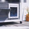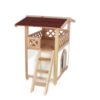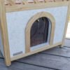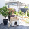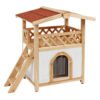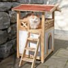 Chic cat villa: the luxurious two-storey cat house offers your furry friends a sheltered outdoor home and is also a real eye-catcher in your garden., Loving details: the garden house for cats has a covered sun terrace, which can be reached via an outdoor wooden staircase. The interior below is protected from wind and rain by a transparent strip curtain., Protects against cold and heat: thanks to the polystyrene-lined walls, the house reliably protects your pets from extreme temperatures in both summer and winter., Weatherproof and safe: a weatherproof bitumen roof protects against moisture, while the varnished spruce and raised plastic feet protect the house from external influences so that you can enjoy it for a long time., Easy assembly: with the enclosed assembly instructions and thanks to a practical plug-in system, the house can be assembled in no time at all.