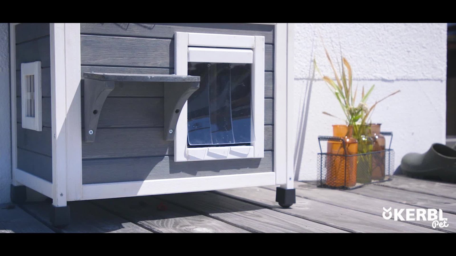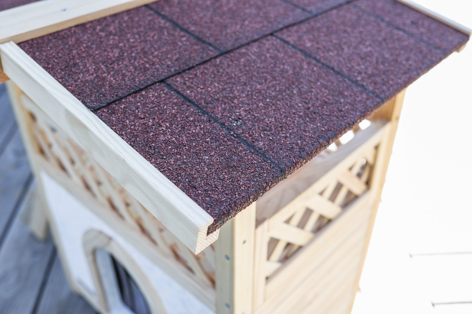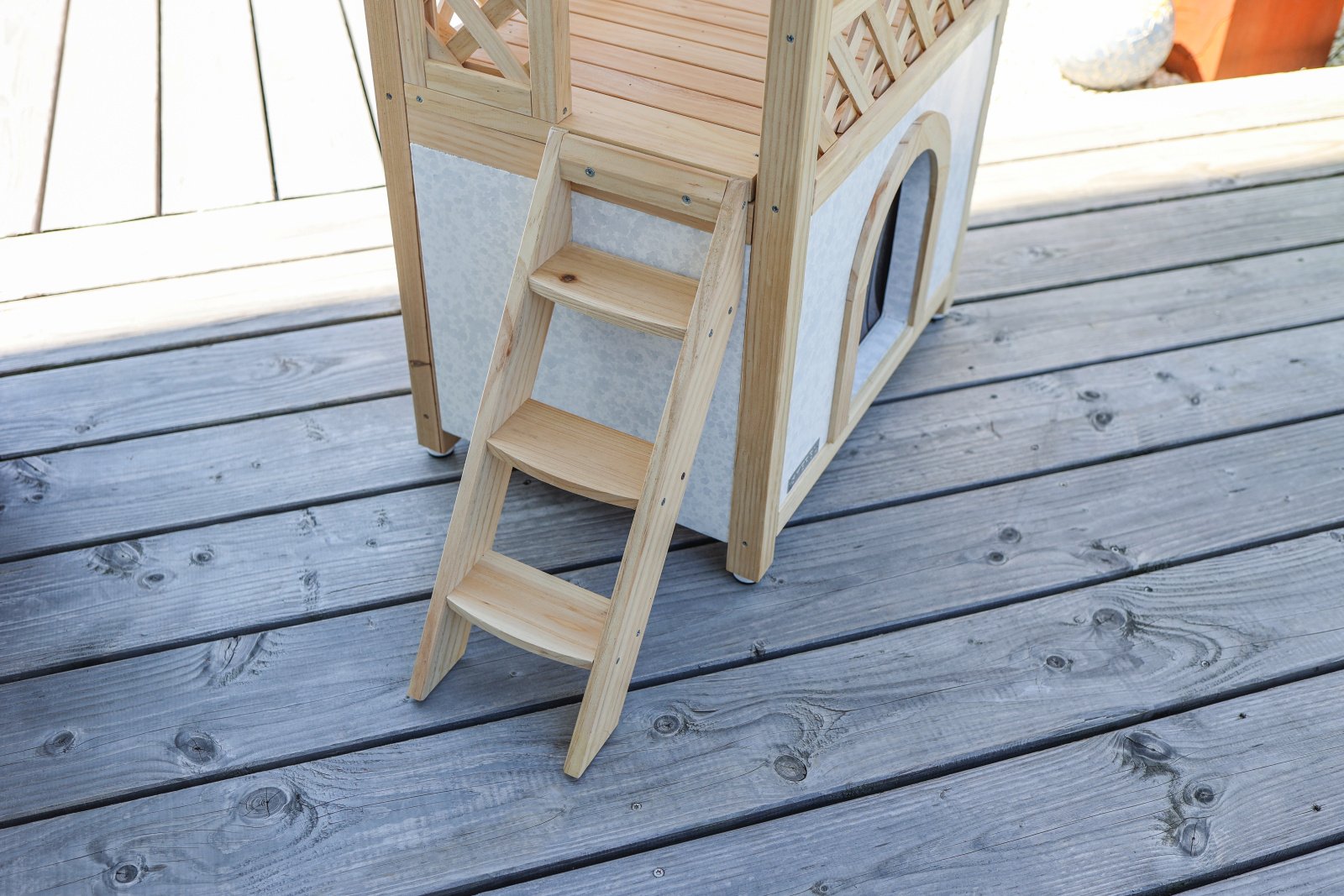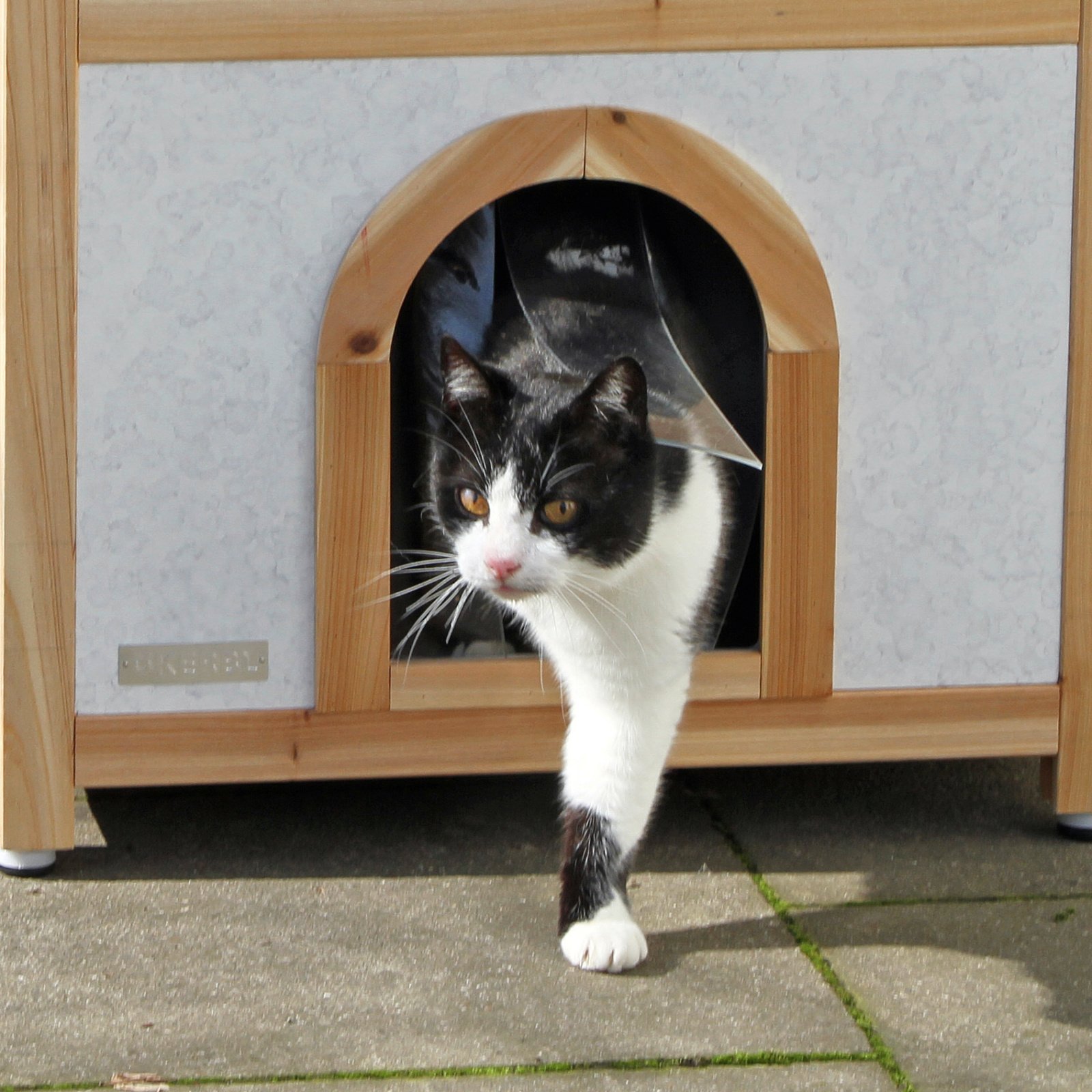 Chic cat villa: the luxurious two-storey cat house offers your furry friends a sheltered outdoor home and is also a real eye-catcher in your garden., Loving details: the garden house for cats has a covered sun terrace, which can be reached via an outdoor wooden staircase. The interior below is protected from wind and rain by a transparent strip curtain., Protects against cold and heat: thanks to the polystyrene-lined walls, the house reliably protects your pets from extreme temperatures in both summer and winter., Weatherproof and safe: a weatherproof bitumen roof protects against moisture, while the varnished spruce and raised plastic feet protect the house from external influences so that you can enjoy it for a long time., Easy assembly: with the enclosed assembly instructions and thanks to a practical plug-in system, the house can be assembled in no time at all.